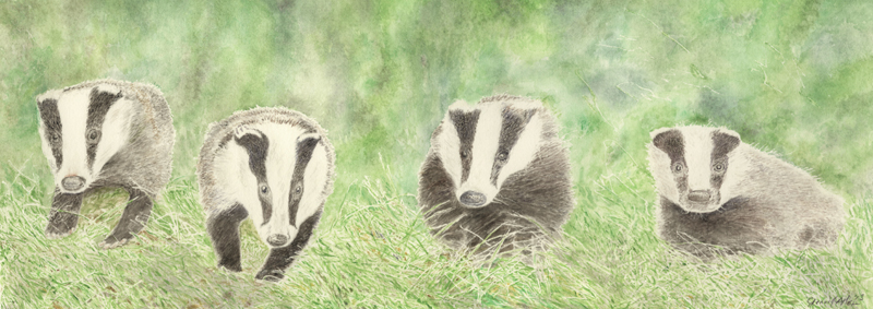 Here they are in go faster stripes on their starting blocks. The badger second left has jumped the gun much to the badger on the immediate left's annoyance. The young rookie entering on the far right has no chance. |